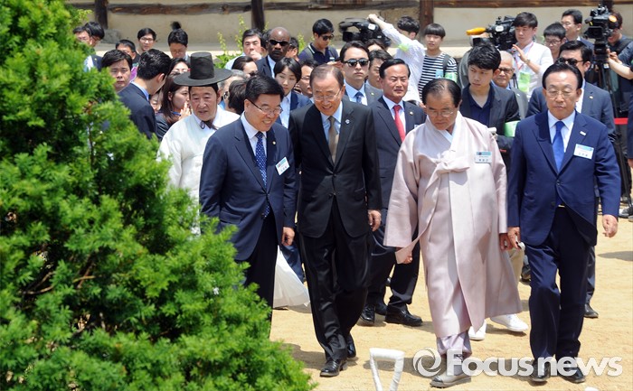 (서울=포커스뉴스) 반기문 유엔 사무총장이 29일 오후 유네스코 세계문화유산으로 등재된 경북 안동 하회마을을 방문해 충효당으로 가고 있다.