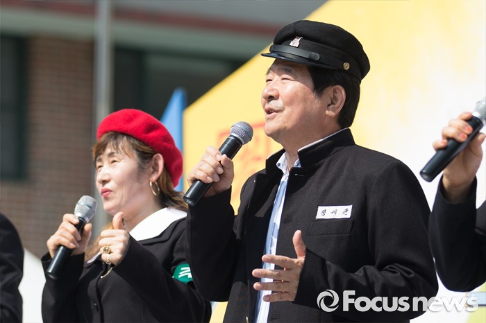 (서울=포커스뉴스) 정세균(오른쪽) 더불어민주당 의원이 29일 오후 서울 종로구 교동초등학교에서 열린 '2016 효자손 어르신 대축제'에 참석해 옛 고등학교 교복과 모자를 쓰고 노래를 부르고 있다.