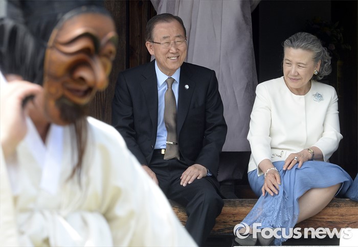 (안동=포커스뉴스) 29일 오후 경북 안동 하회마을을 방문한 반기문 유엔 사무총장과 부인 유순택 여사가 중요무형문화재 제69호 하회별신굿탈놀이를 관람하고 있다.