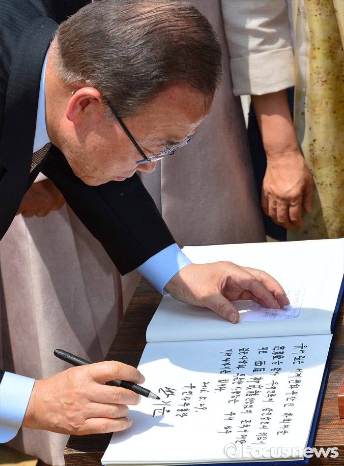 △ 방명록 작성하는 반기문 유엔 사무총장