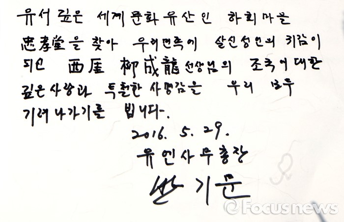 (안동=포커스뉴스) 반기문 유엔 사무총장이 29일 경북 안동 하회마을 성애 류성룡 고택 충효당에서 작성한 방명록.