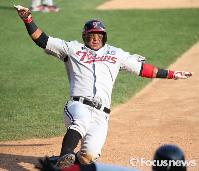(서울=포커스뉴스) 29일 서울 잠실구장에서 열린 2016프로야구 LG-두산 경기 8회초 1사 1,2루에서 LG 황목치승의 안타때 2루주자 히메네스가 홈인하고 있다.