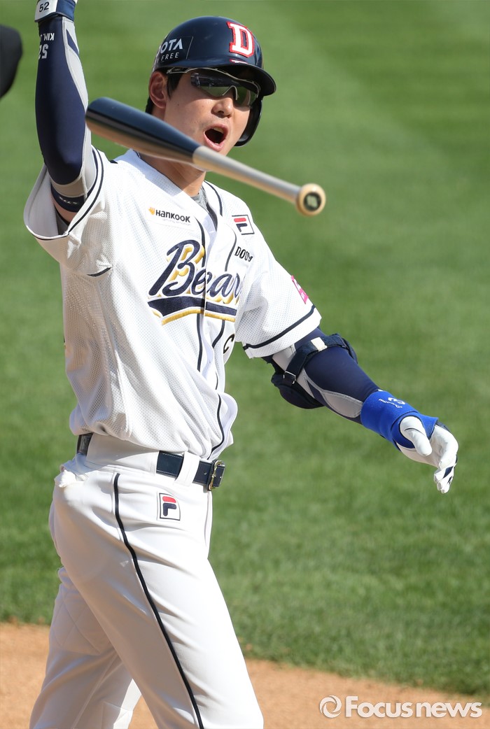(서울=포커스뉴스) 29일 서울 잠실구장에서 열린 2016프로야구 LG-두산 경기 6회말 무사 1루에서 두산 김재호가 몸에 맞는 볼로 진루하며 배트를 던지고 있다.