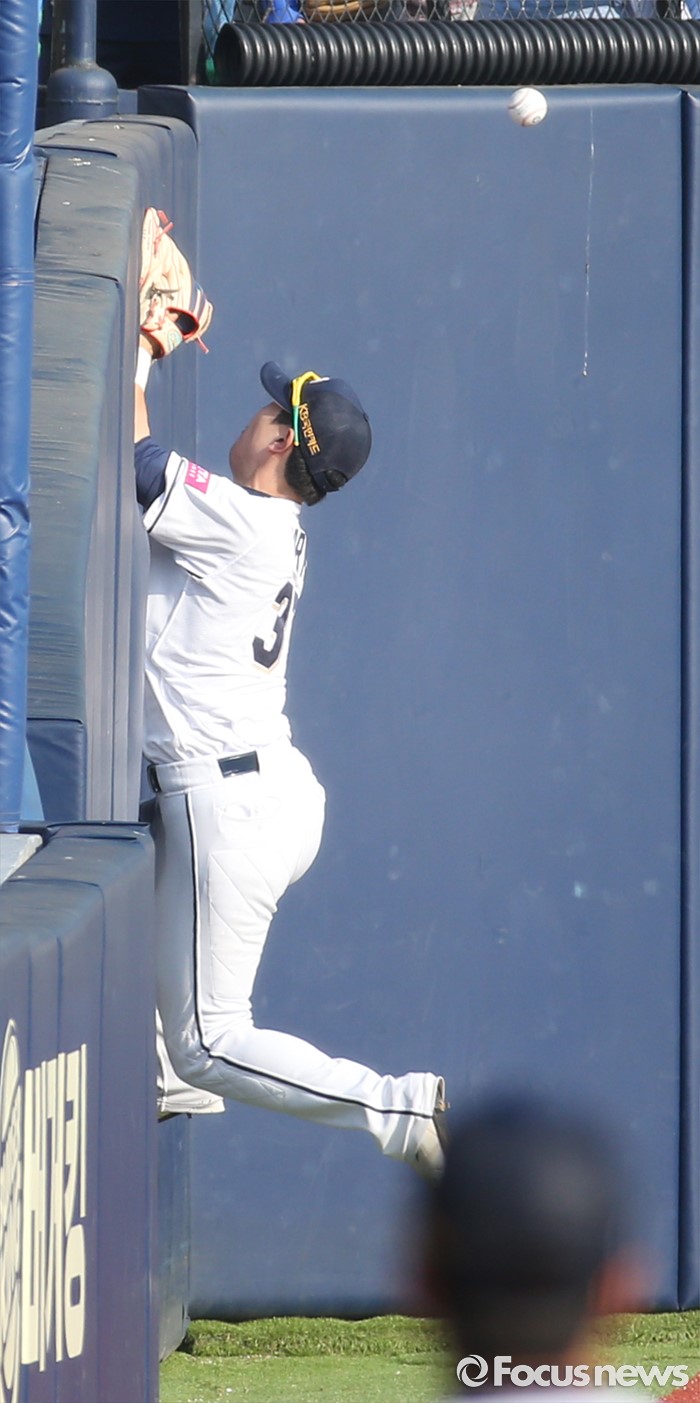 | △ 파울플라이 잡다 펜스에 부딪치는 두산 박건우 |