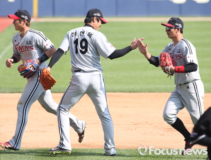 (서울=포커스뉴스) 29일 서울 잠실구장에서 열린 2016프로야구 LG-두산 경기에서 5회말 병살로 실점 위기를 넘긴 LG 투수 정현욱이 2루수 손주인을 반갑게 맞이하고 있다.