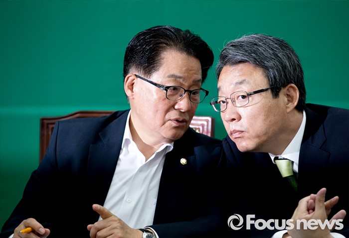 (서울=포커스뉴스) 20대 국회 임기가 시작된 30일 오전 서울 여의도 국회에서 열린 국민의당 최고위원회의에 참석한 박지원(왼쪽) 원내대표와 김성식 정책위의장이 대화하고 있다.