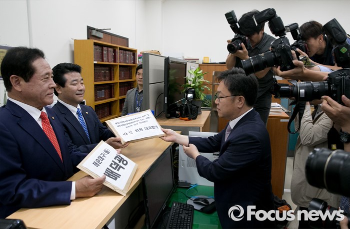 (서울=포커스뉴스) 20대 국회 임기가 시작된 30일 오전 서울 여의도 국회 의안과에서 배덕광 새누리당 의원(2호 법안), 박정 더불어민주당 의원(1호 법안)이 각각 법안 서류를 제출하고 있다.
