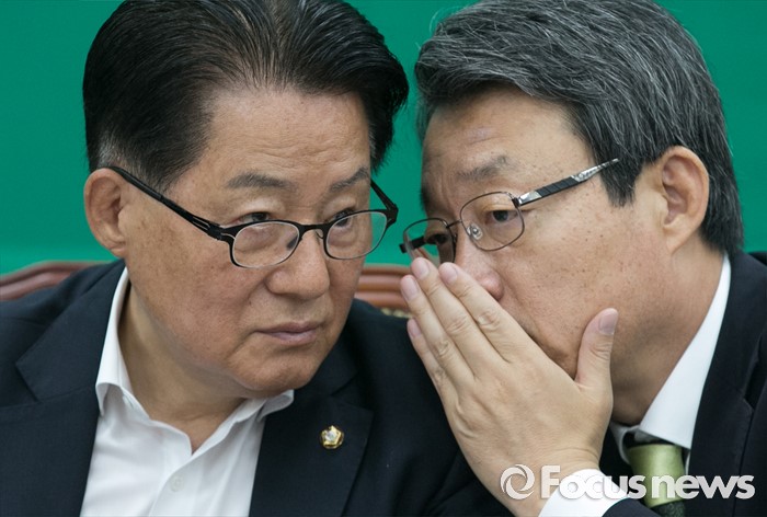 (서울=포커스뉴스) 20대 국회 임기가 시작된 30일 오전 서울 여의도 국회에서 열린 국민의당 최고위원회의에 참석한 박지원(왼쪽) 원내대표와 김성식 정책위의장이 대화하고 있다.