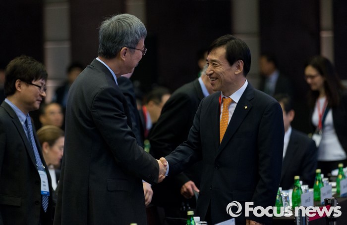 (서울=포커스뉴스) 30일 오전 서울 중구 웨스틴조선호텔에서 열린 2016 한국은행 국제컨퍼런스에서 이주열(오른쪽) 한국은행 총재가 주민 국제통화기금(IMF) 부총재와 인사를 하고 있다.