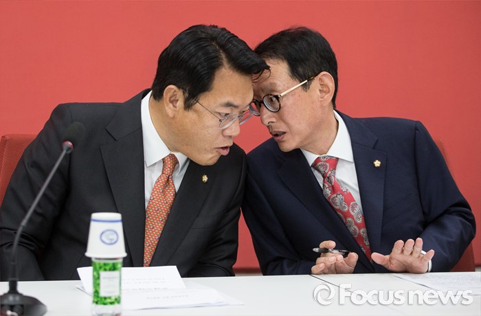 (서울=포커스뉴스) 정진석(왼쪽) 새누리당 원내대표와 김도읍 원내수석부대표가 30일 오전 서울 여의도 국회에서 열린 원내대표단회의에 참석해, 대화하고 있다.