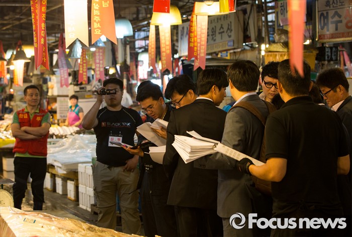 (서울=포커스뉴스) 30일 오전 서울 동작구 구 노량진수산시장에서 서울중앙지법 관계자들이 법원의 점유이전금지가처분을 집행하고 있다. 법원은 이날 영업은 지속하되 수협의 동의없이 가게를 타인에게 이전·전대하면 안된다고 상인들에게 통보 했다.