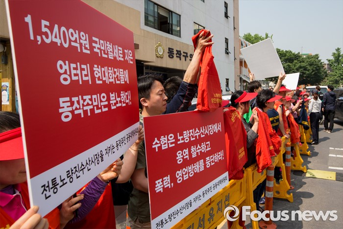 (서울=포커스뉴스) 30일 오전 서울 동작구청에서 노량진수산시장 상인생계대책위원회 관계자들이 박원순 서울시장과의 면담을 요구하며 기다리고 있다.
