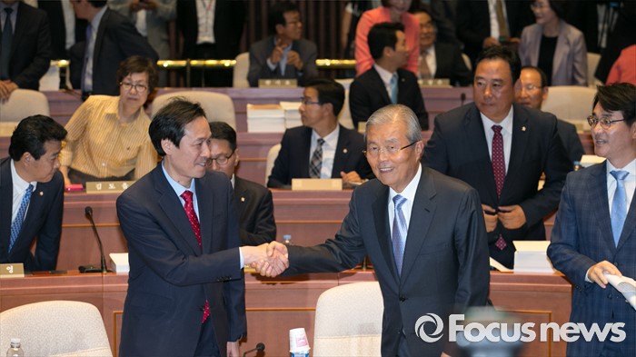 (서울=포커스뉴스) 20대 국회 임기가 시작된 30일 오전 서울 여의도 국회에서 열린 더불어민주당 의원총회에 참석한 김종인(오른쪽) 비대위 대표와 우상호 원내대표가 악수하고 있다.