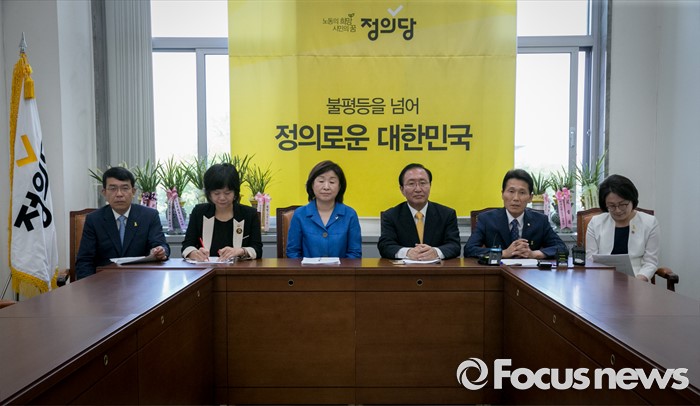 (서울=포커스뉴스) 20대 국회 임기가 시작된 30일 오전 서울 여의도 국회에서 심상정(왼쪽 세번째) 정의당 상임대표와 노회찬(오른쪽 세번째) 원내대표 등 의원단이 20대 국회 개원 기자회견을 하고 있다.