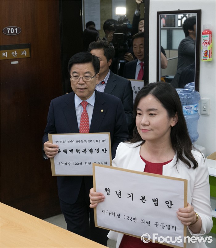 (서울=포커스뉴스) 20대 국회 임기가 시작된 30일 오후 서울 여의도 국회 의안과에서 김광림(오른쪽 두번째) 새누리당 정책위의장, 신보라(오른쪽 첫번째) 청년소통특위 부위원장 등 의원들이 당론 1호법안인 청년기본법과 규제프리존법, 서비스법 등 9개 법안 서류를 제출하고 있다.
