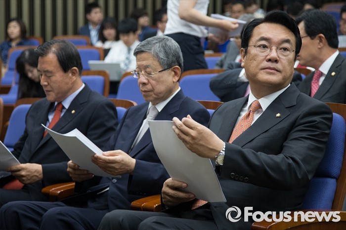 (서울=포커스뉴스) 정진석(오른쪽) 새누리당 원내대표와 김희옥(가운데) 비상대책위원장 내정자가 30일 오전 서울 여의도 국회에서 열린 의원총회에 참석하고 있다.