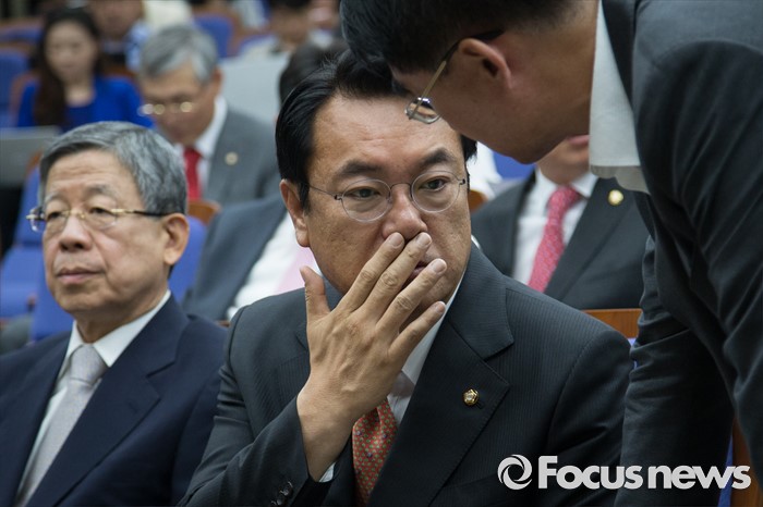 (서울=포커스뉴스) 30일 오전 서울 여의도 국회에서 열린 의원총회에 참석한 정진석(가운데) 원내대표가 동료 의원에게 귀엣말을 하는동안, 김희옥(왼쪽) 새누리당 비상대책혁신위원장 내정자가 자리에 앉아 있다.