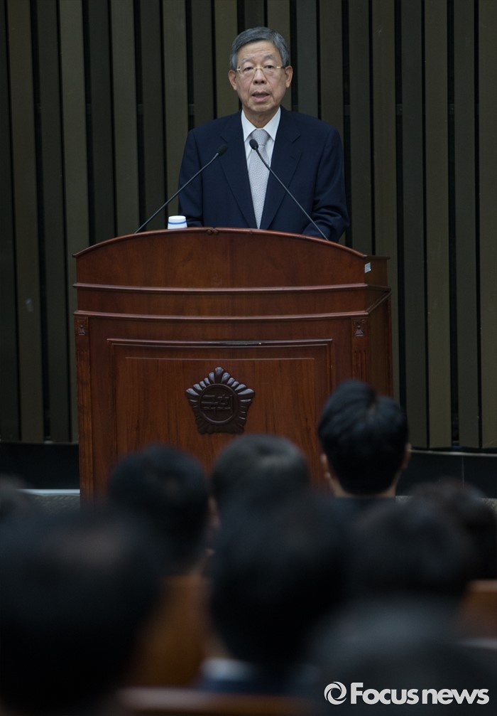 (서울=포커스뉴스) 김희옥 새누리당 비상대책혁신위원장 내정자가 30일 오전 서울 여의도 국회에서 열린 의원총회에 참석해 발언하고 있다.