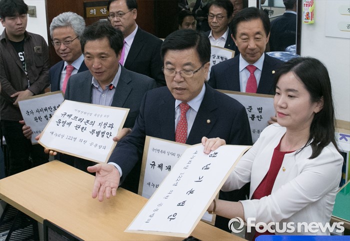 (서울=포커스뉴스) 20대 국회 임기가 시작된 30일 오후 서울 여의도 국회 의안과에서 김광림(오른쪽 두번째) 새누리당 정책위의장, 신보라(오른쪽 첫번째) 청년소통특위 부위원장 등 의원들이 당론 1호법안인 청년기본법과 규제프리존법, 서비스법 등 9개 법안 서류를 제출하고 있다.