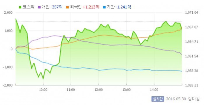이날 코스피는 전거래일 대비 0.03% 상승한 1969.72에 장을 시작했다. 이후 지수는 기관의 대규모 매도에 하락세로 방향을 바꿨다.