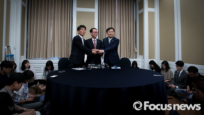 (서울=포커스뉴스) 30일 오후 서울 여의도 국회 귀빈식당에서 열린 20대 국회 원구상 협상 등을 위한 회동에 참석한 김도읍(가운데) 새누리당 원내수석부대표, 박완주(왼쪽) 더불어민주당 원내수석부대표, 김관영 국민의당 원내수석부대표가 취재진을 향해 포즈를 취하고 있다.