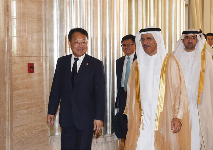 (서울=포커스뉴스) 유일호 부총리 겸 기획재정부 장관이 30일(현지시간) UAE 아부다비 St.REGIS호텔에서 열린 '제5차 한-UAE 경제공동위'에 참석, UAE측 수석대표인 알 만수리 경제부 장관과 함께 회의장에 입장하고 있다. <사진제공=기획재정부>