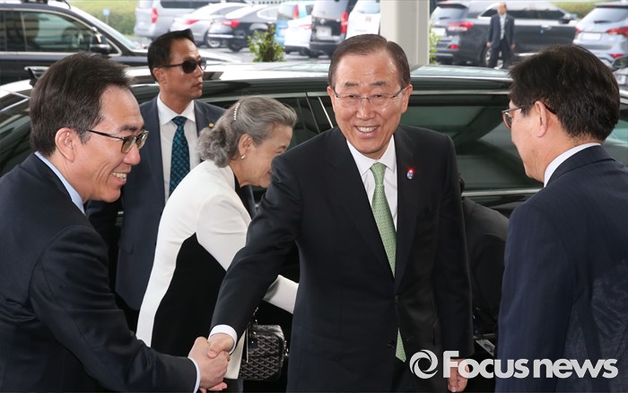 (인천공항=포커스뉴스) 방한 일정을 마친 반기문 유엔 사무총장(가운데)이 30일 오후 출국을 위해 인천국제공항에 도착, 조태열 외교부 제2차관(왼쪽)과 정일영 인천공항공사 사장의 영접을 받고 있다.
