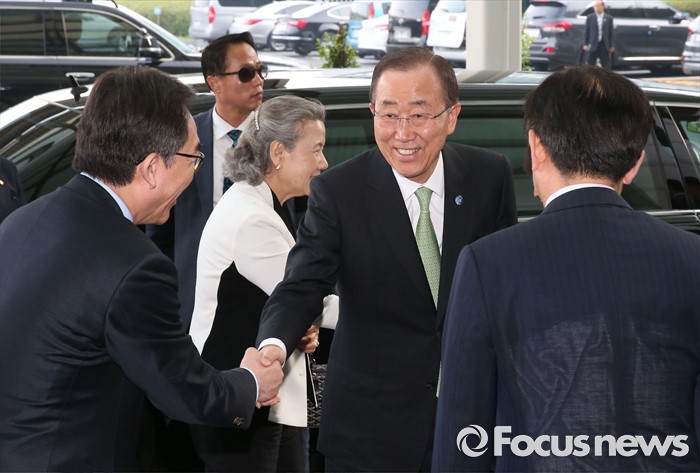 (인천공항=포커스뉴스) 방한 일정을 마친 반기문 유엔 사무총장(가운데)이 30일 오후 출국을 위해 인천국제공항에 도착, 조태열 외교부 제2차관(왼쪽)과 정일영 인천공항공사 사장의 영접을 받고 있다.