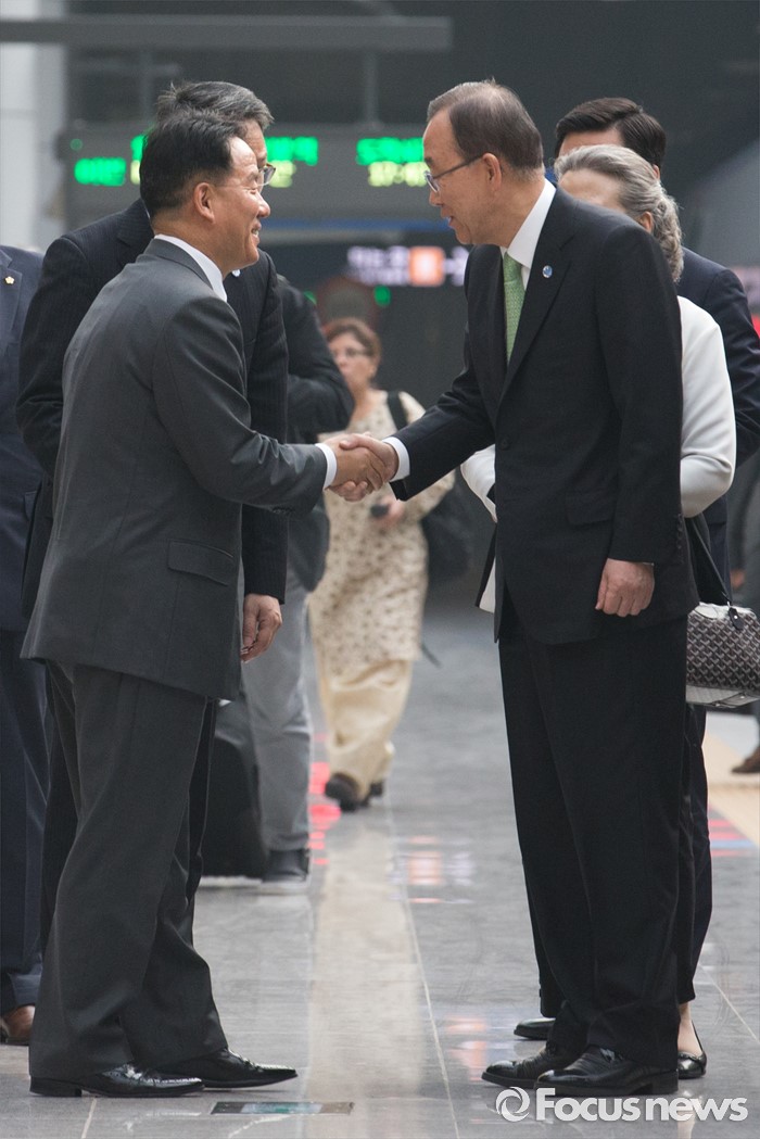 (인천공항=포커스뉴스) 방한일정을 마친 반기문 유엔 사무총장이 30일 오후 인천국제공항 KTX역에 내려 악수를 하고 있다. 반 총장은 "방한 일정과 언론에 보도된 내용, 방한 중 활동과 관련해 오해가 없길 바란다"고 밝혔다.