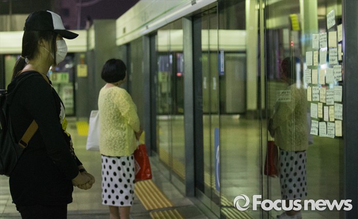 (서울=포커스뉴스) 30일 오후 서울 광진구 구의역 내 스크린도어 사망사고 발생 장소인 9-4 승강장에서 시민들이 고인을 추모하고 있다.