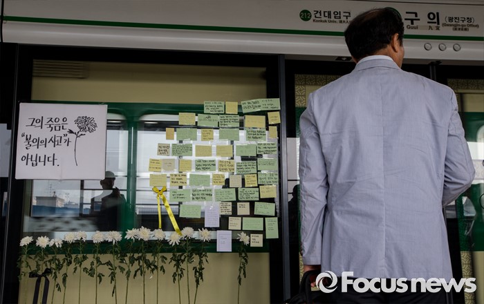(서울=포커스뉴스) 31일 오전 서울 광진구 지하철 2호선 구의역 스크린도어 사고 현장에 시민들의 추모 쪽지 및 국화가 붙어 있다.