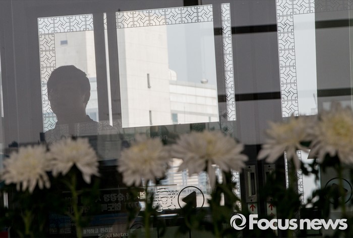 (서울=포커스뉴스) 31일 오전 서울 광진구 지하철 2호선 구의역 스크린도어 사고 현장에 시민들의 추모 국화가 붙어 있다.