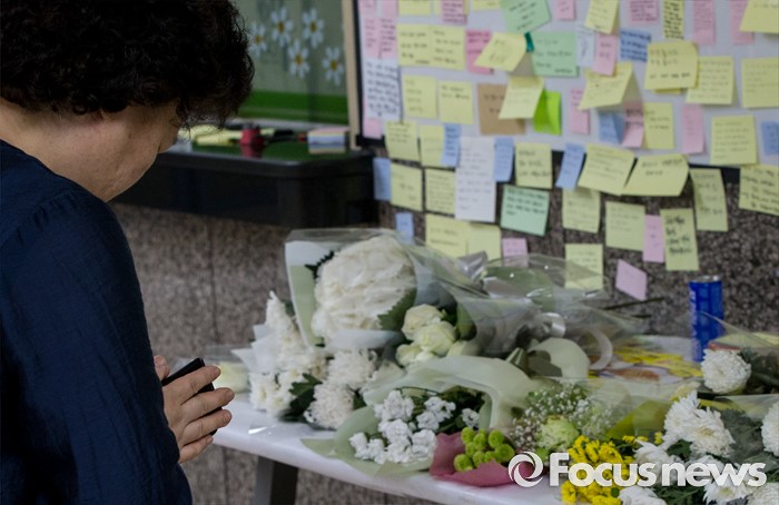 (서울=포커스뉴스) 31일 오전 서울 광진구 지하철 2호선 구의역에 마련된 스크린도어 사고 희생 청년 추모공간에서 한 시민이 고인을 기리는 기도를 하고 있다.