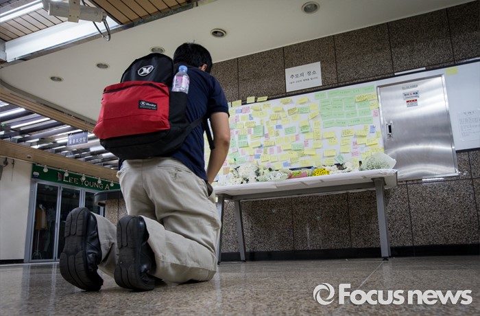 (서울=포커스뉴스) 31일 오전 서울 광진구 지하철 2호선 구의역에 마련된 스크린도어 사고 희생 청년 추모공간에서 한 시민이 고인을 기리는 기도를 하고 있다.