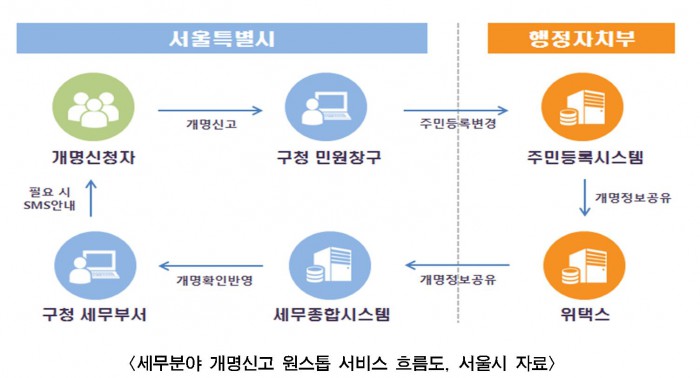 시가 시행하는 '개명신고 원스톱 서비스'는 개명신청자가 주민등록변경을 위해 구청에 개명신고를 하면 행정자치부와 서울시 간 시스템 연계를 통해 세무부서에서 개명정보를 확인한 후 이를 반영할 수 있도록 하는 서비스다.