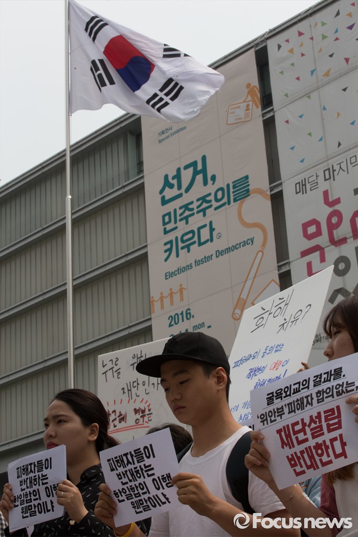 (서울=포커스뉴스) 한일 일본군위안부 합의 무효를 위한 대학생 대책위원회 학생들이 31일 오전 서울 종로구 대한민국역사박물관 앞에서 일본군위안부 피해자 의견 배제한 재단설립 강행 규탄 기자회견을 열고 있다.