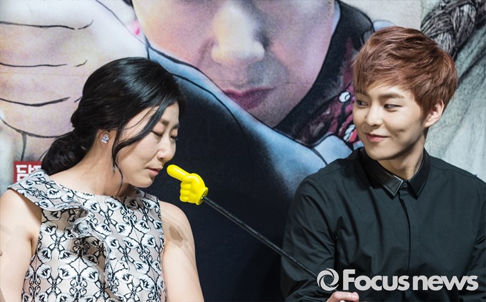 (서울=포커스뉴스) 31일 오전 서울 강남구 압구정CGV에서 열린 영화 '봉이 김선달' 제작보고회에 참석한 배우 시우민(오른쪽)이 인기투표중 라미란에게 한표를 행사하고 있다.