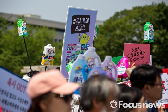 (서울=포커스뉴스) 31일 오후 서울 여의도 국회 앞에서 경제정의실천시민연합 관계자들이 옥시 제품 불매 및 옥시 예방법 제정을 촉구하는 기자회견을 하고 있다.