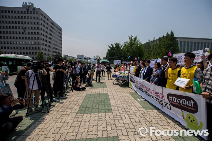 (서울=포커스뉴스) 31일 오후 서울 여의도 국회 앞에서 경제정의실천시민연합 관계자들이 옥시 제품 불매 및 옥시 예방법 제정을 촉구하는 기자회견을 하고 있다.