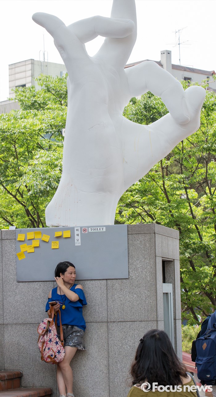 (서울=포커스뉴스) 31일 오후 서울 마포구 홍익대학교 정문에 설치된 극우성향 사이트 '일베' 상징물 조각상 앞에서 중국인관광객이 기념촬영을 하고 있다. 조각상은 일간베스트저장소를 상징하는 자음 'ㅇ'과 'ㅂ' 모양을 하며 회원을 인증하는 손 모양이다. '어디에나 있고, 아무데도 없다'는 제목의 이 조각상은 조소과 4학년 홍기하씨가 '환경조각연구' 수업 과제로 제작해 야외조각전에 출품한 것이다.