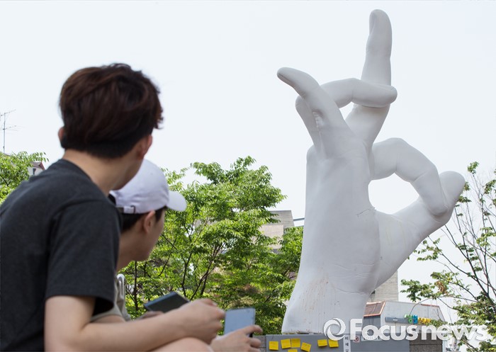 (서울=포커스뉴스) 31일 오후 서울 마포구 홍익대학교 정문에 극우성향 사이트 '일베' 상징물 조각상이 설치돼 있다. 조각상은 일간베스트저장소를 상징하는 자음 'ㅇ'과 'ㅂ' 모양을 하며 회원을 인증하는 손 모양이다. '어디에나 있고, 아무데도 없다'는 제목의 이 조각상은 조소과 4학년 홍기하씨가 '환경조각연구' 수업 과제로 제작해 야외조각전에 출품한 것이다.