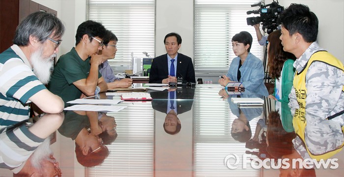 (서울=포커스뉴스) 우상호(오른쪽) 더불어민주당 원내대표가 31일 오전 서울 여의도 국회에서 열린 '가습기 살균제 피해자 가족 면담'에 앞서 참석자들과 악수 하고 있다.