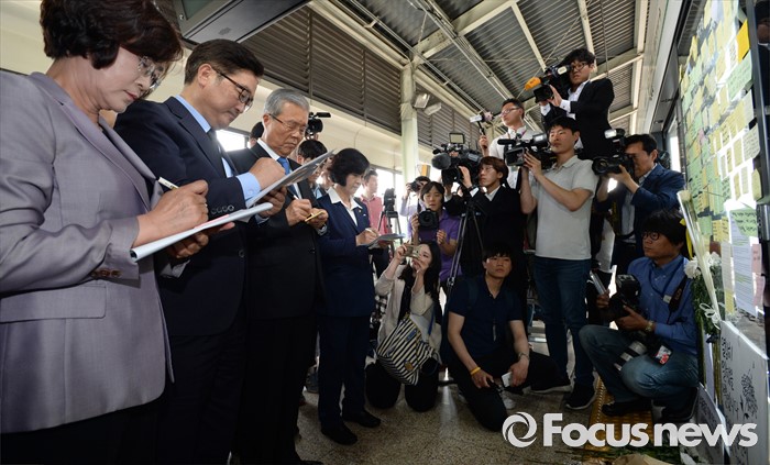 (서울=포커스뉴스) 김종인 더불어민주당 비대위 대표와 을지로위원회 소속 의원들이 31일 오후 서울 광진구 지하철 구의역에서 스크린도어 정비 작업 중 사고로 숨진 김모(19) 씨의 사건장소를 방문해 고인을 추모하는 메모를 작성하고 있다.