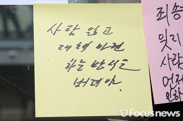 (서울=포커스뉴스) 김종인 더불어민주당 비대위 대표가 31일 오후 서울 광진구 지하철 구의역에서 스크린도어 정비 작업 중 사고로 숨진 김모(19) 씨의 사건장소를 방문해 추모의 메모를 남겼다. 사진은 김 대표가 남긴 추모 메모.