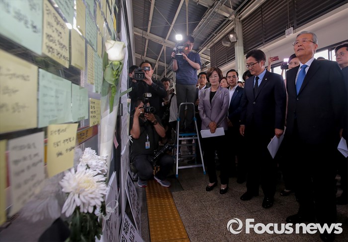 (서울=포커스뉴스) 김종인 더불어민주당 비대위 대표와 을지로위원회 소속 의원들이 31일 오후 서울 광진구 지하철 구의역에서 스크린도어 정비 작업 중 사고로 숨진 김모(19) 씨의 사건장소를 방문해 고인을 추모하고 있다.