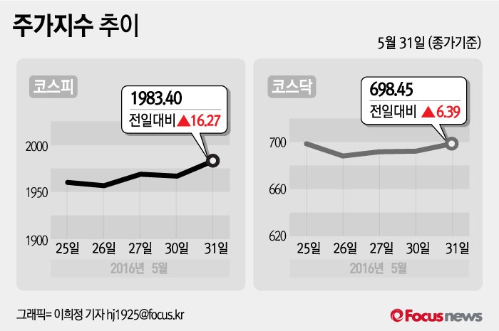 (서울=포커스뉴스) 31일 코스피지수는 전날 보다 0.83%(16.27포인트) 오른 1983.40에 장을 마쳤다. 코스닥지수는 전일 대비 0.92%(6.39포인트) 오른 698.45에 마감했다.