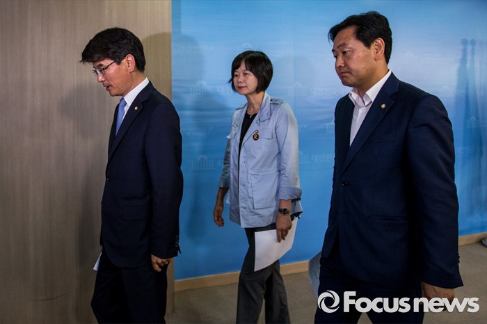 (서울=포커스뉴스) 야3당 원내수석부대표들이 31일 오후 서울 여의도 국회에서 가습기 살균제 사건, 세월호특별법 제정, 어버이연합 게이트 등 현안 공조 관련 브리핑을 마친 뒤 기자회견장을 나서고 있다. 오른쪽부터 김관영 국민의당 원내수석부대표, 이정미 정의당 원내수석부대표, 박완주 더불어민주당 원내수석부대표.