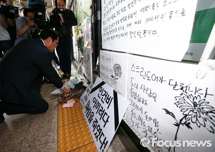 (서울=포커스뉴스) 정진석 새누리당 원내대표가 31일 오후 서울 광진구 지하철 구의역에서 스크린도어 정비 작업 중 사고로 숨진 김모(19) 씨의 사건장소를 방문해 고인을 추모하고 있다.