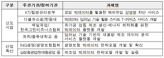 안전분야에서 KT와 질병관리본부는 통신로밍 빅데이터를 활용하여 메르스, 지카 등과 같은 해외 감염병의 국내 유입을 차단을 추진하고, 유통분야에서는 더블유쇼핑과 한동대가 홈쇼핑 편성에 딥러닝을 이용해 마케팅과 매출 향상에 활용할 예정이다.