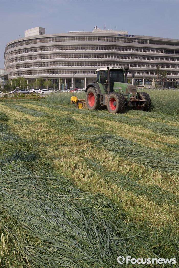 (세종=포커스뉴스) 31일 오후 세종시 정부세종청사 인근 한국토지주택공사 부지에 심은 호밀을 수확하고 있다.
